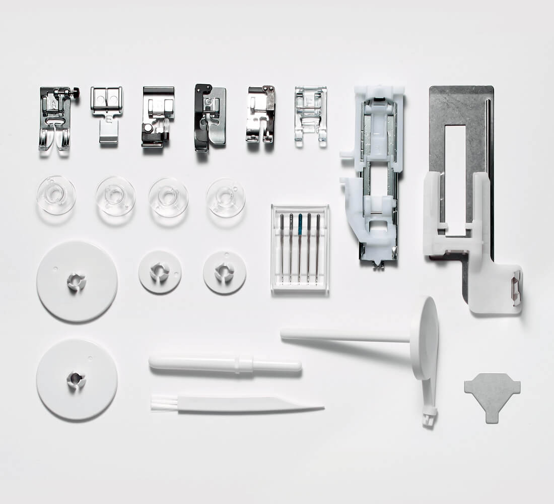 - 200 dostępnych programów ściegowych, w tym ściegi użytkowe, elastyczne, superowerlokowy, ozdobne, dziurki