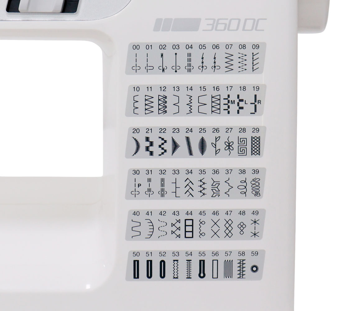 - 60 dostępnych programów ściegowych, w tym ściegi proste, użytkowe, owerlokowe, kryte, satynowe, ozdobne i dziurki