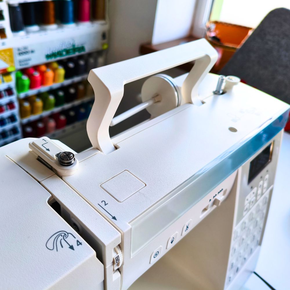 Maszyna użyta do testów nowych akcesoriów - z tego względu to urządzenie jak nowe, wykorzystane wyłącznie przez naszych pracowników do przetestowania nowych małych dodatków, które sprawdzamy przed wprowadzeniem do oferty sklepu. Niektóre elementy maszyny zostały rozpakowane, wyposażenie jest kompletne. Dołączamy do maszyny również drobny gratis w postaci poduszki do wbijania szpilek, małych nożyczek, dwóch nitek, miarki i szpilek.