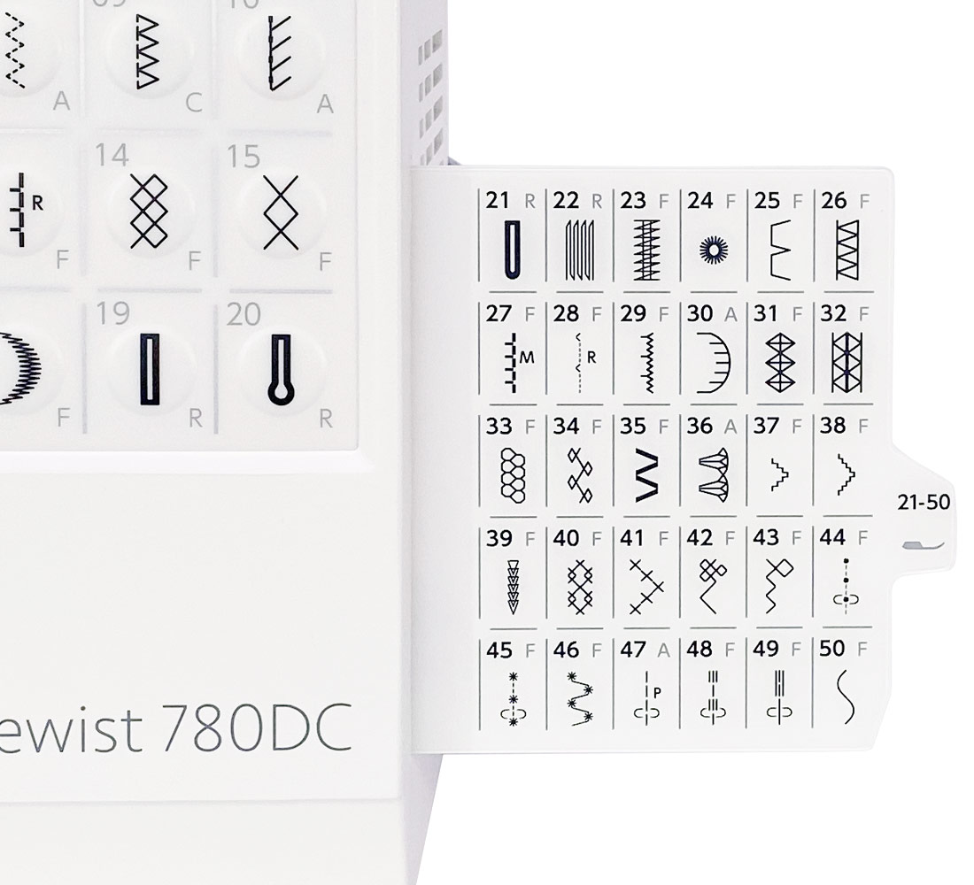 - 80 dostępnych programów ściegowych, w tym ściegi proste, zygzak, elastyczne, owerlokowe, kryte, satynowe, ozdobne i dziurki