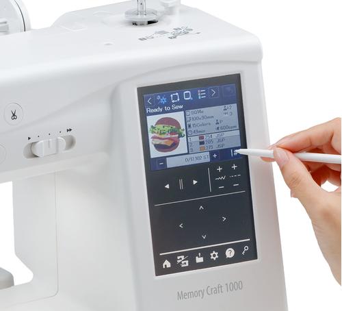 - Duży, czytelny dotykowy wyświetlacz, prezentujący informacje o hafcie: ilość wkłuć, wymiary wzoru,ilość kolorów, prędkości haftowania, a także czas potrzebny na wykonanie haftu
