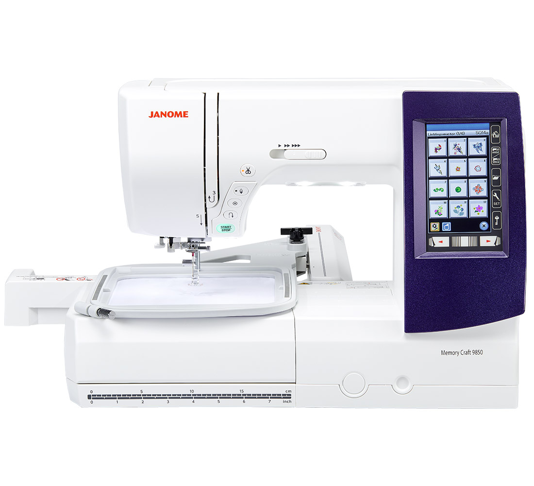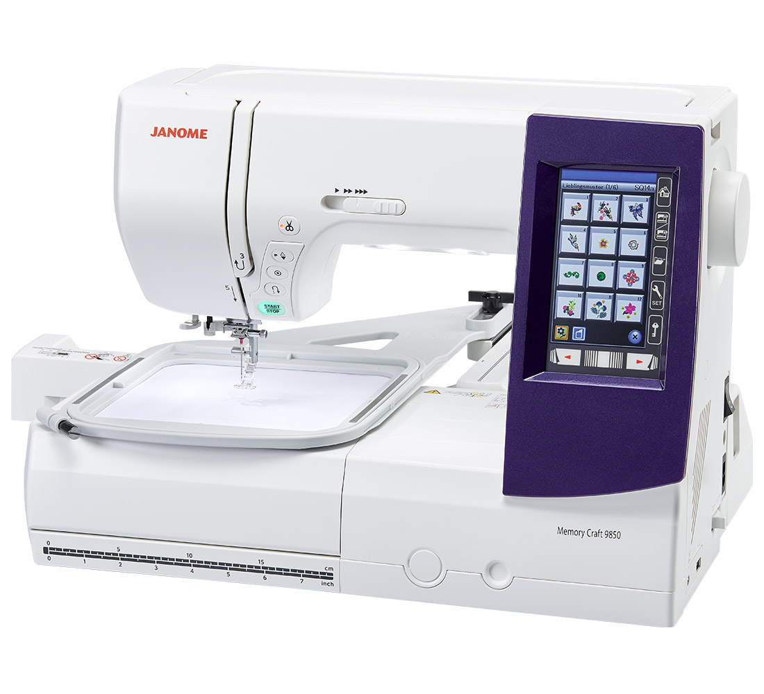 Maszyno - hafciarka Janome MC9850 jest większa i szybsza niż standardowe maszyny do szycia. Jej przestrzeń pomiędzy igłą, a ramieniem maszyny wynosi 21 cm (standardowo maszyny mają około 17 cm), natomiast prędkość szycia wynosi 1000 wkłuć na minutę. W funkcji szycia do dyspozycji Janome MC9850 oferuje 570 programów ściegowych, w tym są ściegi proste (stebnowe), elastyczne, owerlokowe, piękne ozdobne, a także 6 rodzajów automatycznego obszywania dziurki i alfabet z polskimi znakami (wygodna opcja, gdy chcesz wyszyć mały napis, a nie haftować). Wszystkie dostępne programy ściegowe są umieszczone na górnej pokrywie maszyny.
