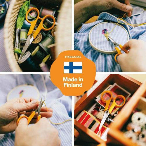 Nożyczki Fiskars Classic 10 cm są małe i bardzo precyzyjne, świetnie sprawdzą się przy pracach wymagających dokładności. Ostrza ze stali nierdzewnej są ostro zakończone i perfekcyjnie dopasowane, dzięki czemu umożliwiają czyste cięcie nawet w trudno dostępnych miejscach. Idealne do haftu, wycinania aplikacji, cięcia papieru czy drobnych elementów tkanin.