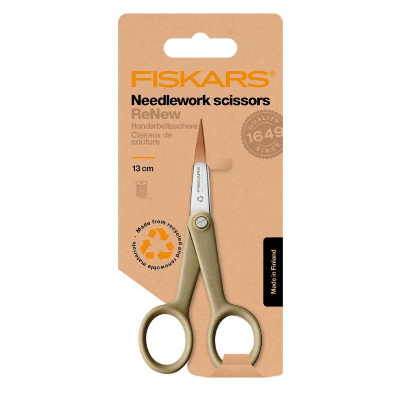 Nożyczki uniwersalne Fiskars ReNew to seria nożyczek stworzona z materiałów pochodzących z recyklingu, w 100% nadających się do ponownego przetworzenia.