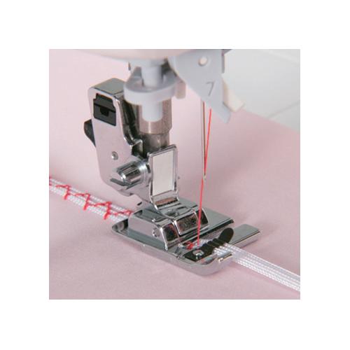 Stopka służy do naszywania ozdobnych sznurków na materiał. Możemy do niej wprowadzić 1, 2 lub 3 sznurki o maksymalnej średnicy do 1,5mm. Pozwala również na zastosowanie igły podwójnej. Tylko od nas zależy czy naszyte sznurki będą miały być widoczne i tym samym ozdabiać nasz projekt, czy też służyć zwiększeniu wypukłości ściegu.